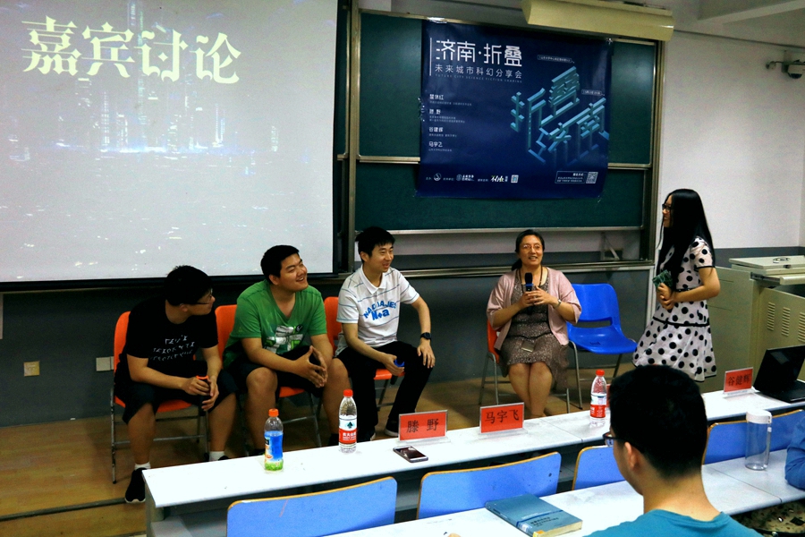 2017年5月13日晚7时,山东大学学生科幻协会、果壳未来事务管理局及不存在日报在中心校区理综楼联合举办济南折叠——未来城市科幻分享会活动。我校土建学院副教授谷健辉、未来事务管理局作家滕野、济南本地资深科幻爱好者楚休红、科幻协会会长马宇飞作为特约嘉宾出席。本次分享会由科幻协会前会长刘慧颖学姐主持,我校各校区数十名科幻爱好者参加。