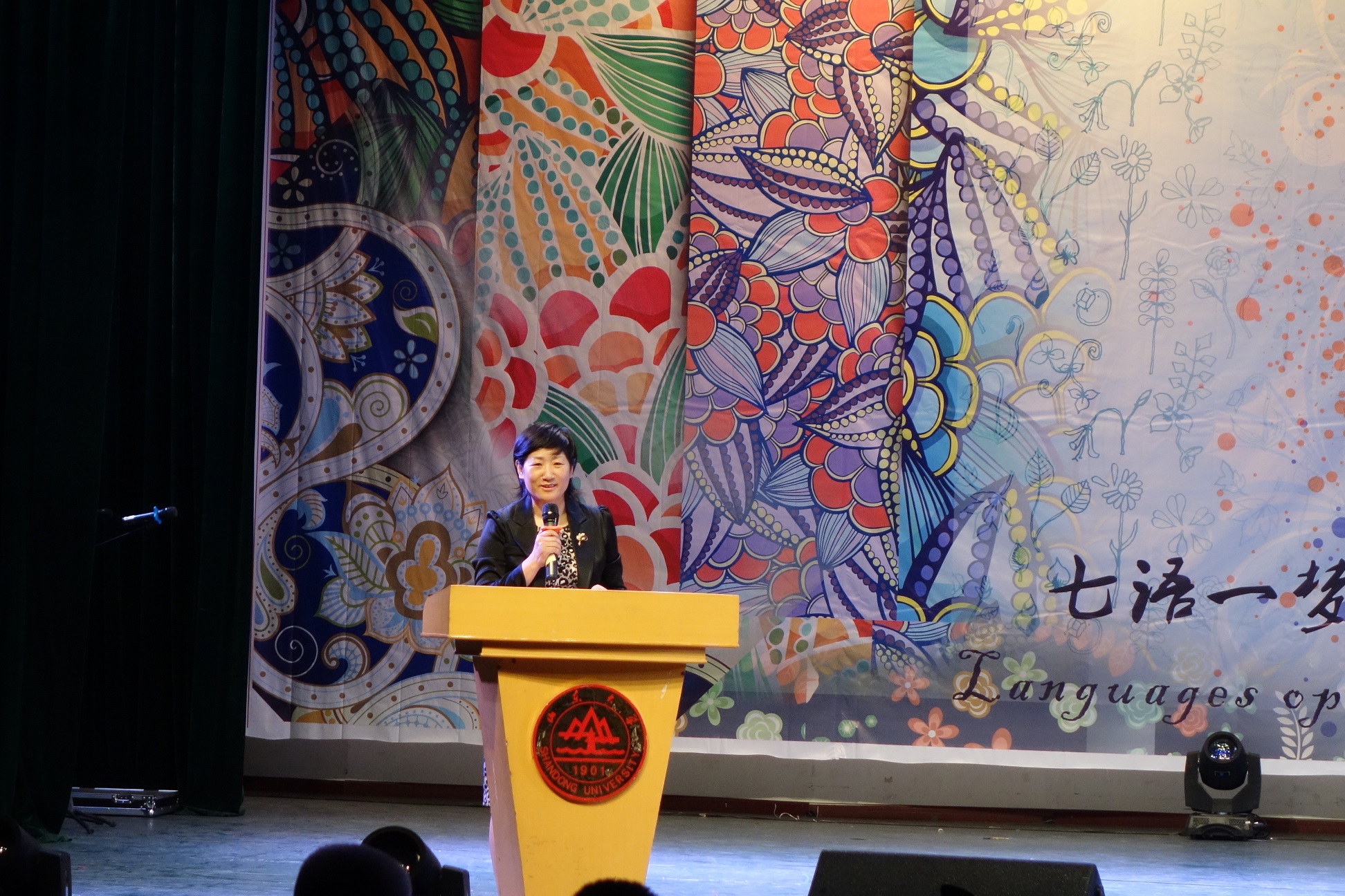 在晚会伊始,外国语学院院长王俊菊为本次晚会致辞。王俊菊首先表达了对到场嘉宾的感谢和为活动成功举行而付出辛勤劳动的师生的祝福与期待。王俊菊在致辞中回顾了外国文化节的主旨目的和现实意义。外国语学院一贯秉持山东大学“为天下储人才,为国家图富强”的办学宗旨,致力于培养适应新时代新要求的国际化人才,为全校学生提供异域文化体验经历、异国文化学习氛围,促进学生成长发展。为了拓展外语学习者的国际视野,繁荣校园文化多样性,满足当代大学生的发展要求,传承语言文化,弘扬山大精神,外国语学院创办并持续举办了外国文化节。外国文化节以丰富多彩的形式为同学们提供了一个同学习、同进取、同感知外国文化的和谐环境,以达到同学们健身心、求知识、强技能、善交往的目的。