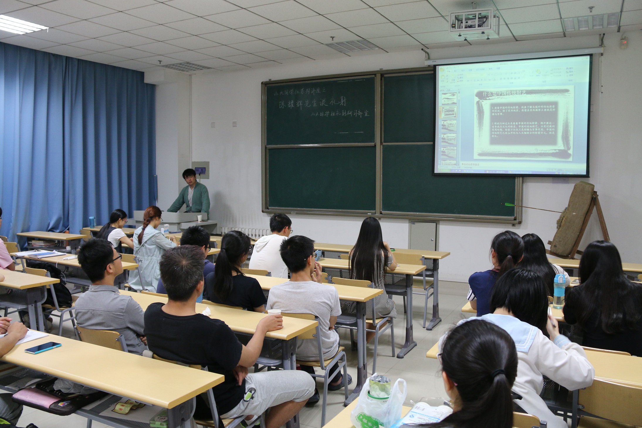 周五18时,陈耀辉先生着一袭青色直裾,携其角弓竹箭,来到知新楼为国学社同学及传统文化爱好者讲传统射艺。落座少时,陈先生为各位一展其高超箭术,一箭中的,分毫不差,满座皆惊异。遂讲传统射艺的定义、由来、发展、射礼、技法等诸多方面知识,从文化继承、个人修养讲述传统射艺的精神内涵。“前推泰山,后发虎尾”“发而不中,反求诸己”“射以观盛德”……射艺的魅力在两个小时内得到了淋漓尽致地展现。期间现身说法,以其这些年亲身经历,向同学们展示了这一项传统运动的强大生命力。